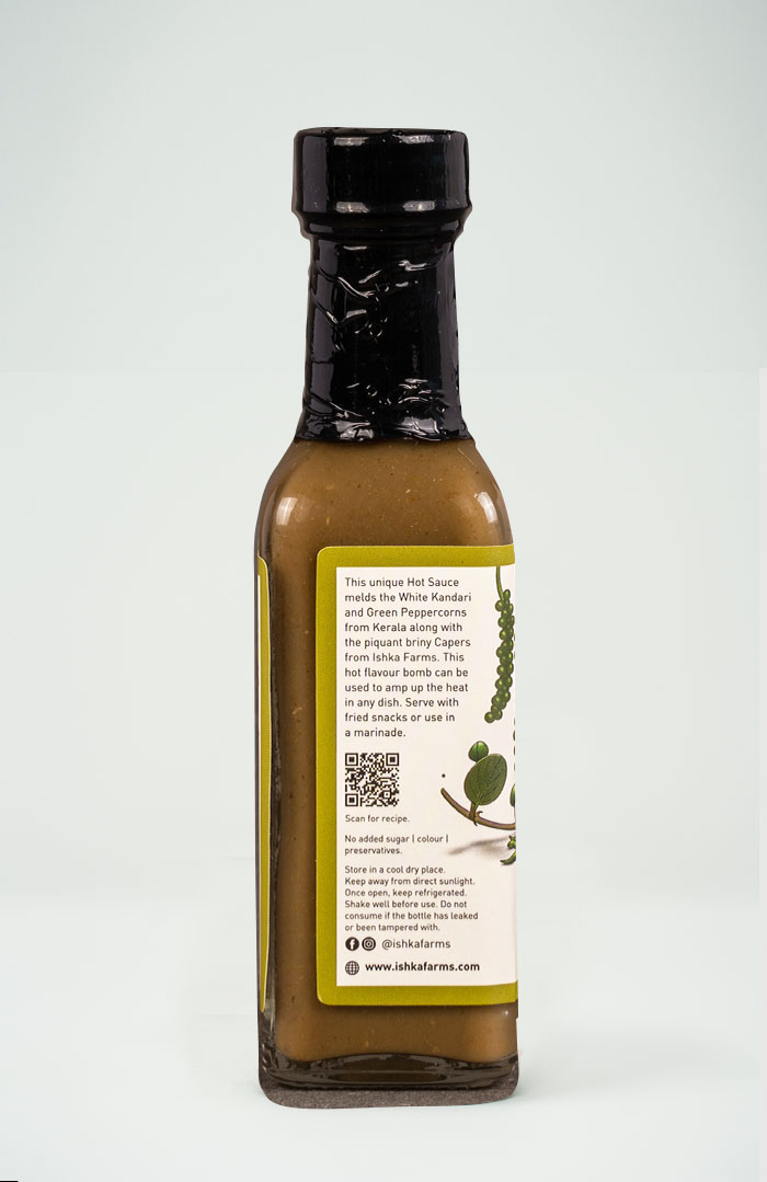 As the name suggests, this hot sauce is made from some of the most famous and indigenous flavours of Kerala – the white Kandari chillies (Bird’s eye Chillie) add their unique spicy, and floral notes, the tingling heat from Green Peppercorns plucked at their peak, along with the subtle saltiness from the Ishka Capers. The sauce is a flavour bomb and is versatile – alongside sandwiches or any fried snacks, add to stews or pastas to amp up their heat and flavour profile or use as a base for a salad dressing.
