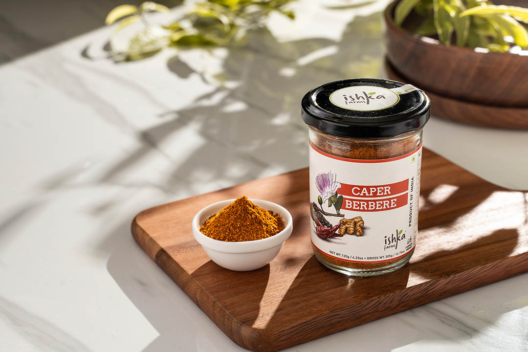 Inspired from Ethiopian cuisine, our Caper Berbere is a blend of the Ishka Farms Caper Salt and spices ubiquitous to Kerala. This versatile spice mix can be used to marinate ahead of time or simply to sprinkle on the barbeque while pan-frying or grilling. Sprinkle our Berbere over any steaks of meat, chicken, fish or even vegetables like cauliflower/brussel sprouts and sear in a pan with butter to enjoy its aromas and nuttiness in its simplest form.