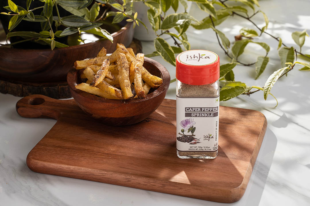 We see our Caper Pepper sprinkle to be at every dinner table in households across the globe. The aroma and heat of some of the best Black Peppercorns sourced from the Western Ghats of Kerala blend in harmony with the umami of the Ishka Caper Salt. It makes for a perfect topping on eggs, popcorn or any fried snack ( we love it over a good tempura). It can be used to season dips, marinades and dressings.
